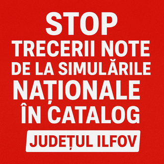 Stop trecerii notelor de la simulările naționale în catalog – Județul IlfovSimulările trebuie să fie un instrument de învățare, NU o sursă de presiune, anxietate sau penalizare. 💬 De aceea cerem Inspectoratului Școlar Ilfov: 1. Să emită o clarificare oficială că notele de la simulări NU sunt obligatoriu de trecut în catalog. 2. Să transmită tuturor școlilor din Ilfov interdicția de a obliga elevii să accepte nota. 3. Să asigure un cadru unitar și corect pentru toți copiii din județ. Dacă ești de acord, semnează și distribuie petiția, pentru ca toți elevii să fie tratați echitabil.28 din 100 SemnăturiInițiat de Cristina Eftimie