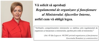 Regulament de organizare şi funcţionare la MAI(1) Obligaţia ministrului este prevăzută expres la art. 45 din Legea nr. 90/2001 privind organizarea şi funcţionarea Guvernului României şi a ministerelor: "Atribuţiile compartimentelor ministerelor se stabilesc prin regulamentul de organizare şi funcţionare a ministerului, aprobat prin ordin al ministrului." (2) Fără Regulament de organizare şi funcţionare nu există persoana juridică Ministerul Afacerilor Interne [art. 187, 188 şi 1.179 din Noul Cod civil]. (3) Cetăţeanul care ocupă funcţia de ministru trebuie sprijinit de ceilalţi cetăţeni să-şi exercite obligaţiile. Tu, dacă ai fi ministru, ai alege să-ţi execuţi obligaţiile date de lege fără o contrapresiune din partea cetăţeanului?100 din 200 SemnăturiInițiat de Dumitru Rentea