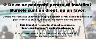 Reducerea burselor – decizii de moment ce ne amenință viitorulMinisterul Educației și Cercetării intenționează să reducă drastic bugetul burselor școlare și să elimine bursele de reziliență și tehnologice. Propunerea de a raporta bursele la salariul minim net și nu brut ascunde o diminuare reală a sprijinului acordat elevilor. Asta ar însemna mai puțin sprijin exact pentru copiii care au cea mai mare nevoie de el. De asemenea, putem lua ca exemplu o clasă cu 25 de elevi, dintre care 4 au media anuală 10. Doar acești elevi, respectiv primii 15% din clasa respectivă, vor putea beneficia de bursa de merit, pe când în alte școli cu rezultate mai slabe, vor lua bursă elevi cu media 9,00. Acest lucru intenționează revenirea la perioada în care bursele erau dezechilibrate, insuficiente și lipsite de impact real. Bursele sociale, de reziliență și tehnologice sunt instrumente esențiale care ajută elevii vulnerabili să rămână la școală. România are cea mai mare rată de părăsire timpurie a școlii din Uniunea Europeană și 4 din 10 adolescenți nu ating pragul de alfabetizare funcțională. 1 din 3 copii trăiește în sărăcie. Ele nu sunt un cadou sau un privilegiu, ci un drept – acoperă cheltuieli de bază precum transportul, rechizitele sau hainele și sunt condiționate de prezența la cursuri, ceea ce încurajează participarea și progresul în învățare. Banii alocați acestor burse nu sunt o cheltuială, ci o investiție în viitorul României, în echitate și coeziune socială. Sprijinul acordat copiilor vulnerabili este prevăzut inclusiv în Strategia Națională privind Incluziunea Socială și Reducerea Sărăciei și în Planul de acțiune pentru implementarea acesteia. Feedbackul constant din partea directorilor și profesorilor din comunitatea noastră arată clar: acolo unde s-au extins bursele, copiii vin mai mult la școală și sunt mai motivați să învețe. Afirmația „[...] sistemul de burse pe care îl avem noi în preuniversitar nu există nicăieri în Europa şi că e anormal să numeşti de merit ceea ce iau 30% dintre elevii din sistem.” este, în esență, falsă. Majoritatea țărilor europene oferă diferite forme de sprijin financiar elevilor de nivel preuniversitar, chiar dacă nu sunt organizate sub forma exactă a sistemului românesc, exemple pertinente pot fi cele din vestul Europei (Franța, Germania), cât și țările nordice (Norvegia, Finlanda, Suedia). Faptul că un procent mare de elevi primesc bursă de merit poate fi un semn al unui sistem care încurajează progresul și performanța la scară largă, nu doar excelența absolută. Educația nu este un concurs piramidal: dacă doar primii 15% ar primi bursă de merit, ar însemna că sistemul sprijină doar elita, ignorând efortul și rezultatele bune ale unui număr semnificativ de elevi. O bursă poate însemna o recompensă pentru consecvență, nu doar pentru excepțional. Consiliul Național al Elevilor susține menținerea acestor burse, afirmând că ele nu sunt un favor, ci o necesitate pentru combaterea abandonului școlar și susținerea performanței. Bursele sunt un drept fundamental și un instrument esențial pentru combaterea inegalităților și abandonului școlar. Semnează dacă vrei ca educația să rămână o șansă reală pentru toți copiii, nu un privilegiu pentru câțiva!23.064 din 25.000 SemnăturiInițiat de Consiliul Național al Elevilor